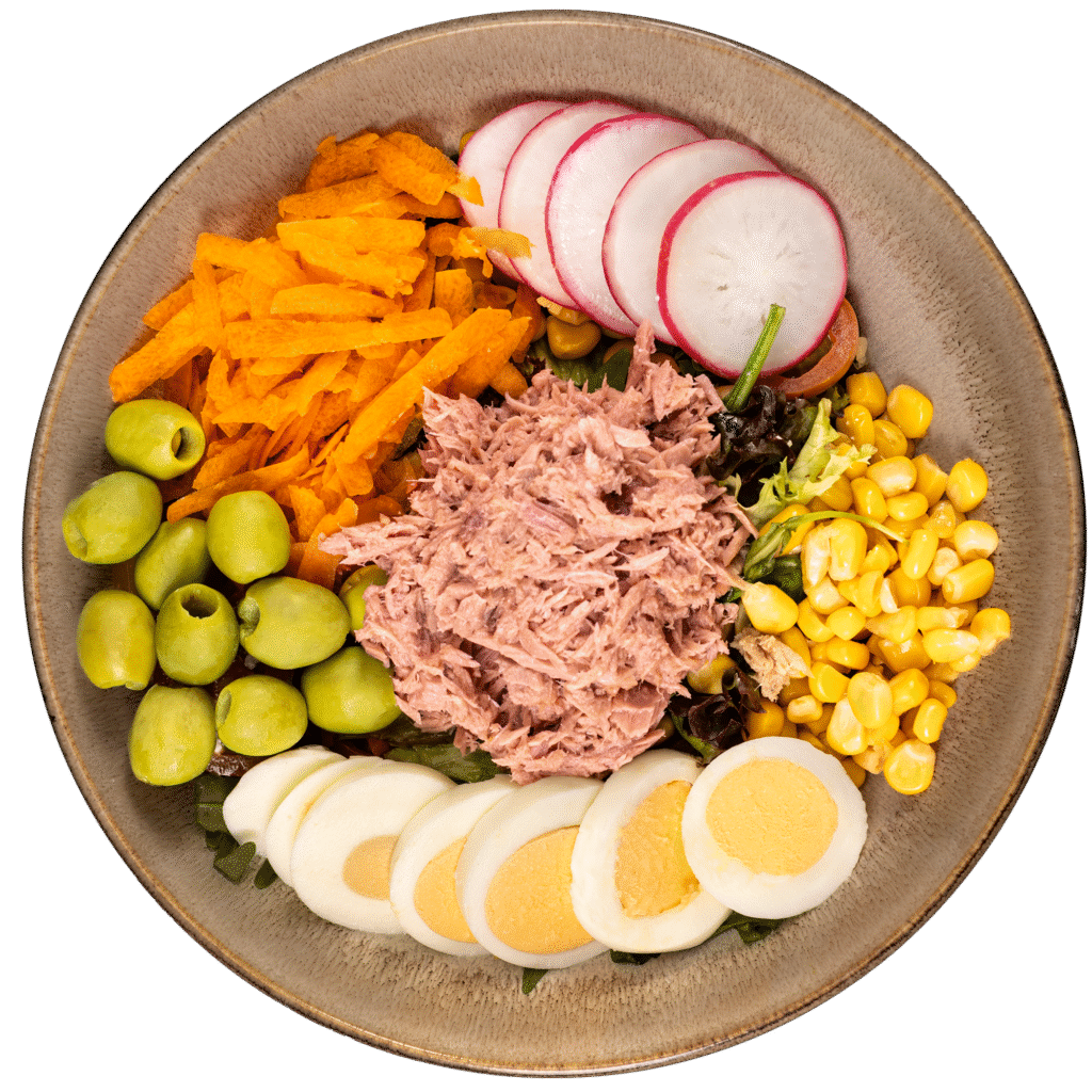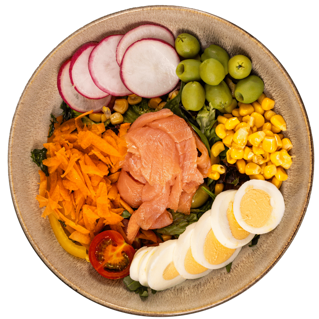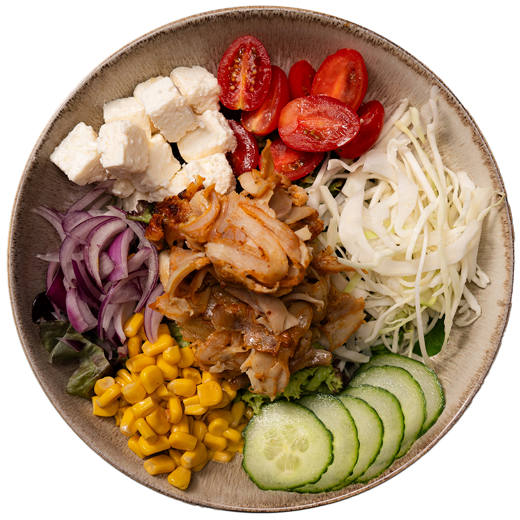 zmes šalátov, kapusta, kukurica, červená cibuľa, cherry paradajky, uhorka, balkánsky syr, kuracie mäso