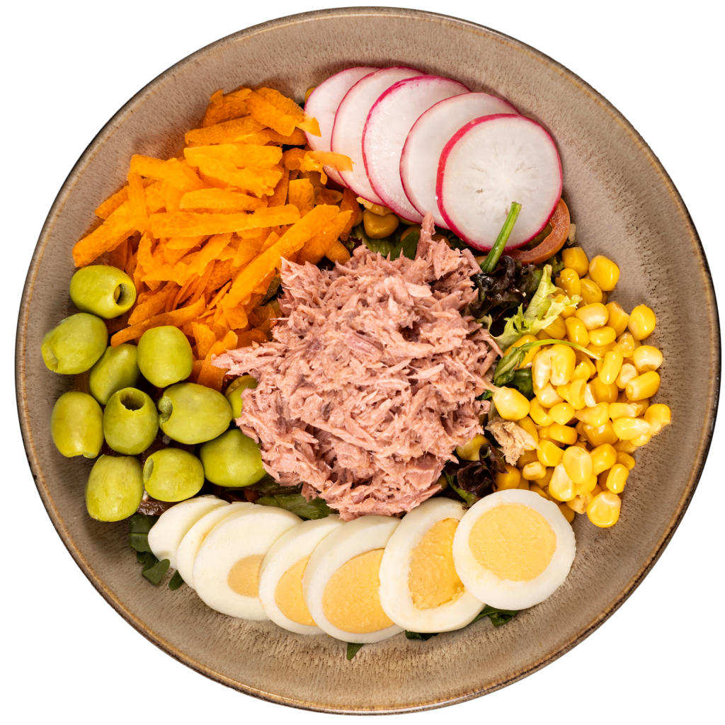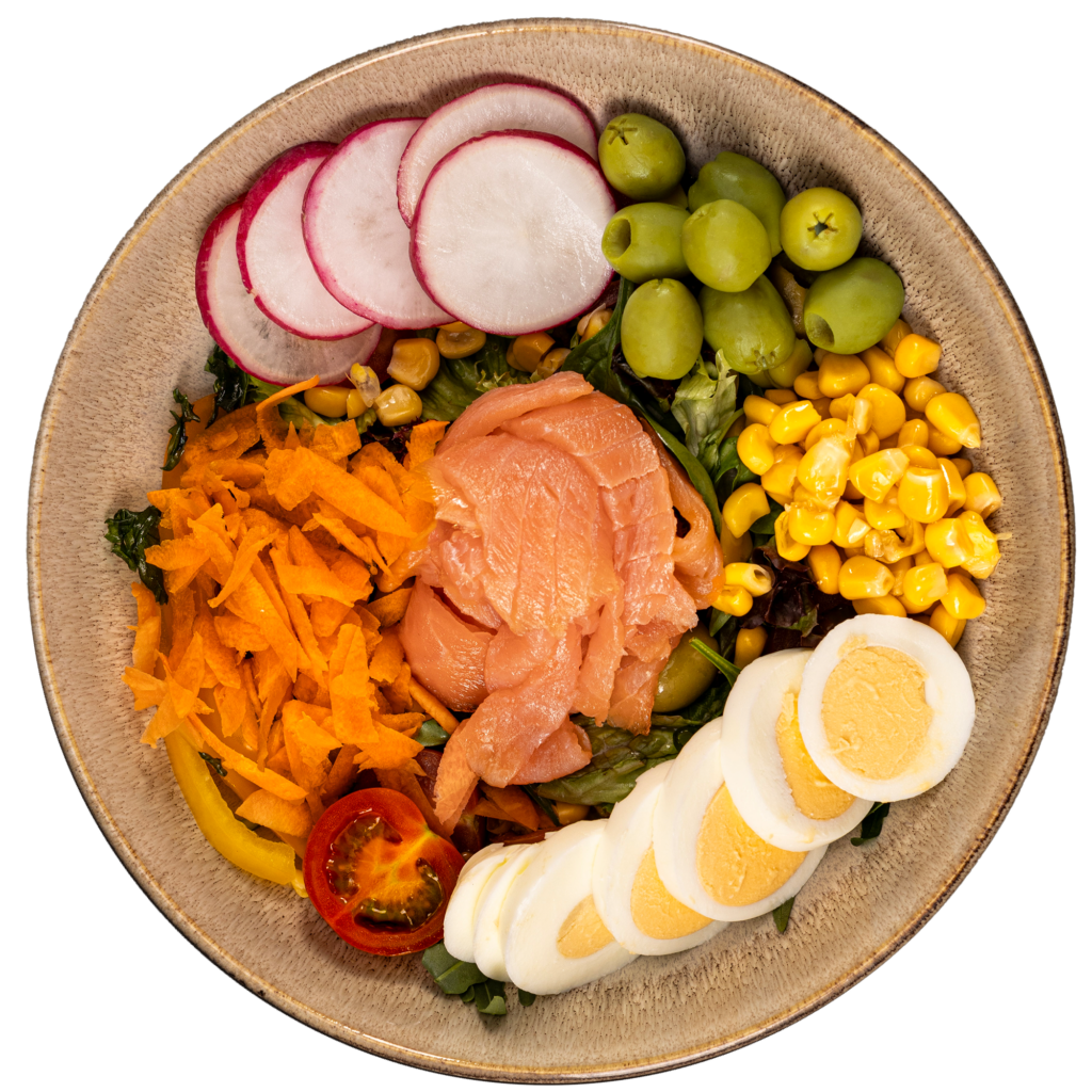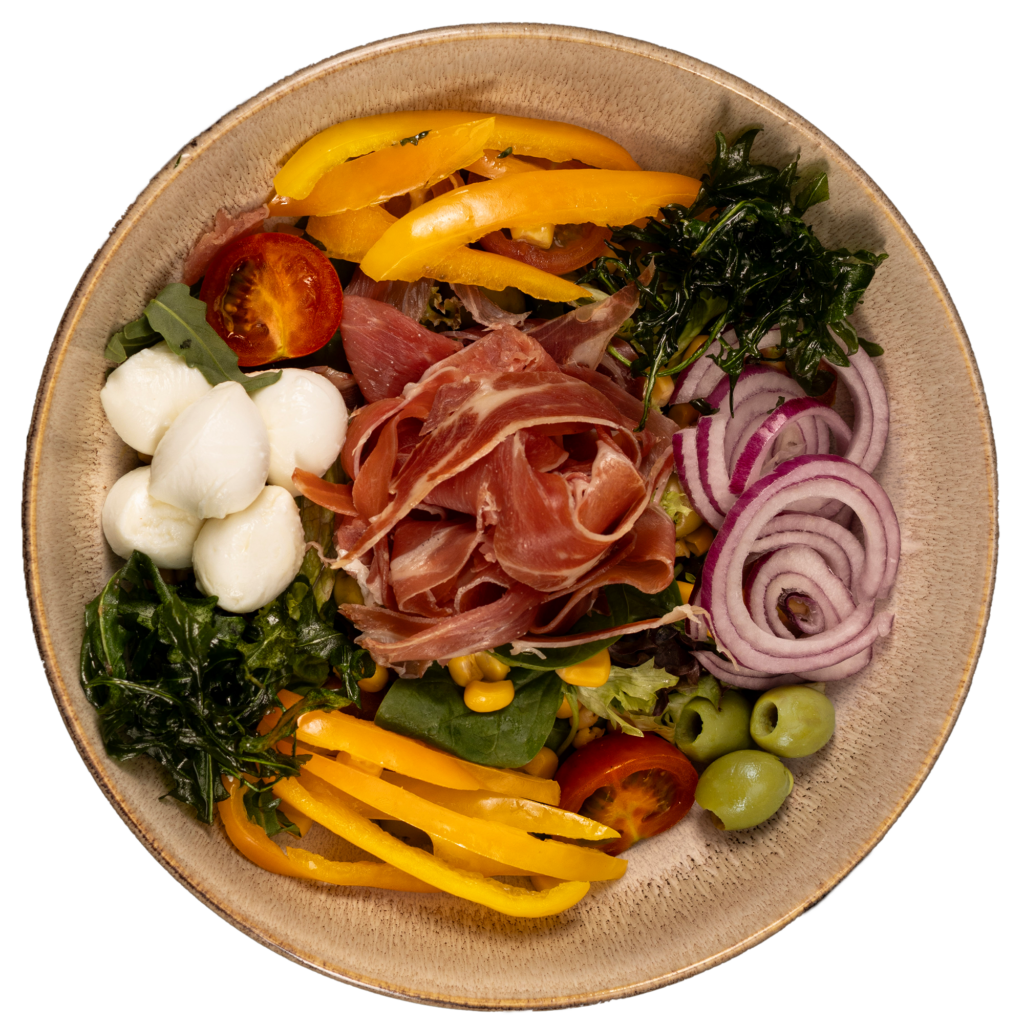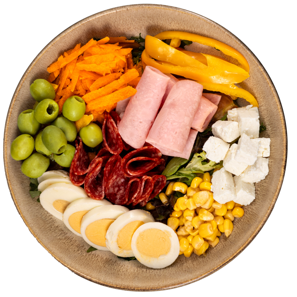 zmes šalátov, kapusta, kukurica, červená cibuľa, cherry paradajky, uhorka, balkánsky syr, kuracie mäso