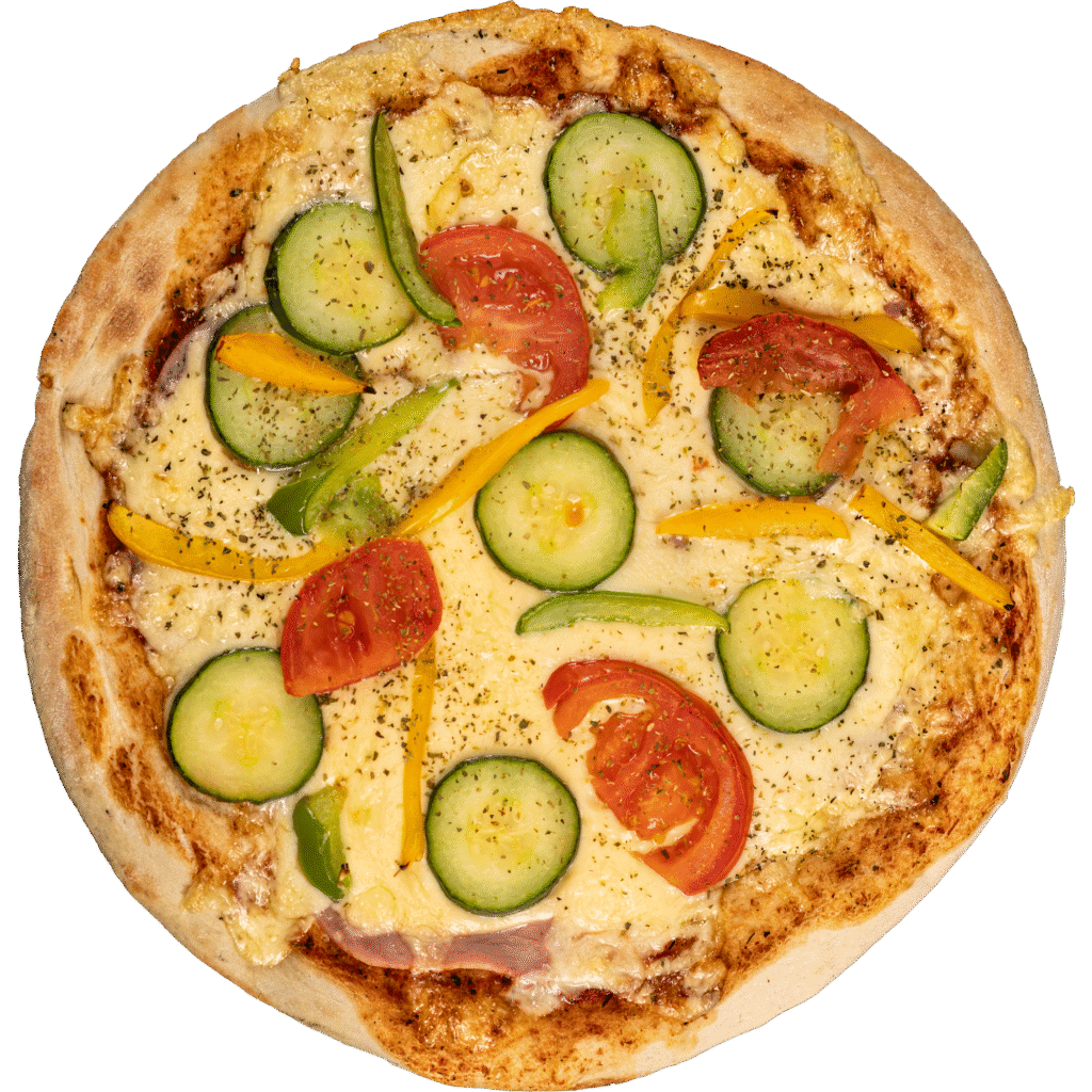 cesto, par. omáčka, syr, šunka, paprika, paradajky, uhorky, oregáno