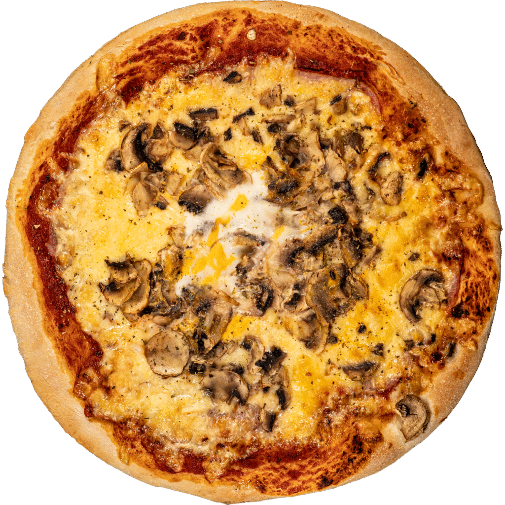cesto, par. omáčka, syr, šunka šampiňóny, vajíčko, oregáno