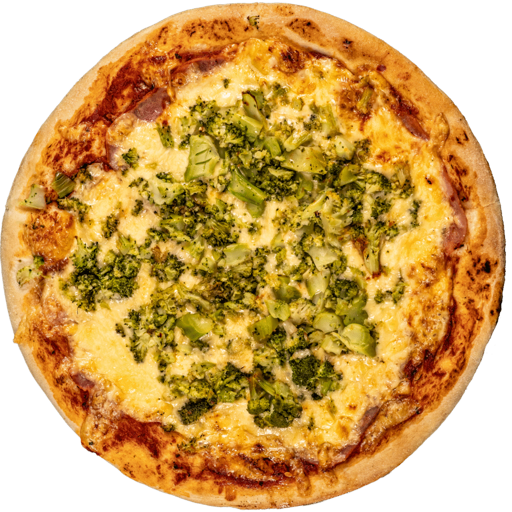 cesto, par. omáčka, syr, šunka, brokolica, cesnak, oregáno